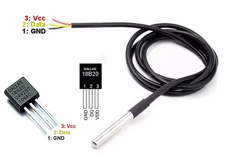 Nebenstehendes Bild zeigt die Anschlussbelegung eines DS18B20 Sensors, zum einen als Bauteil und zum anderen als