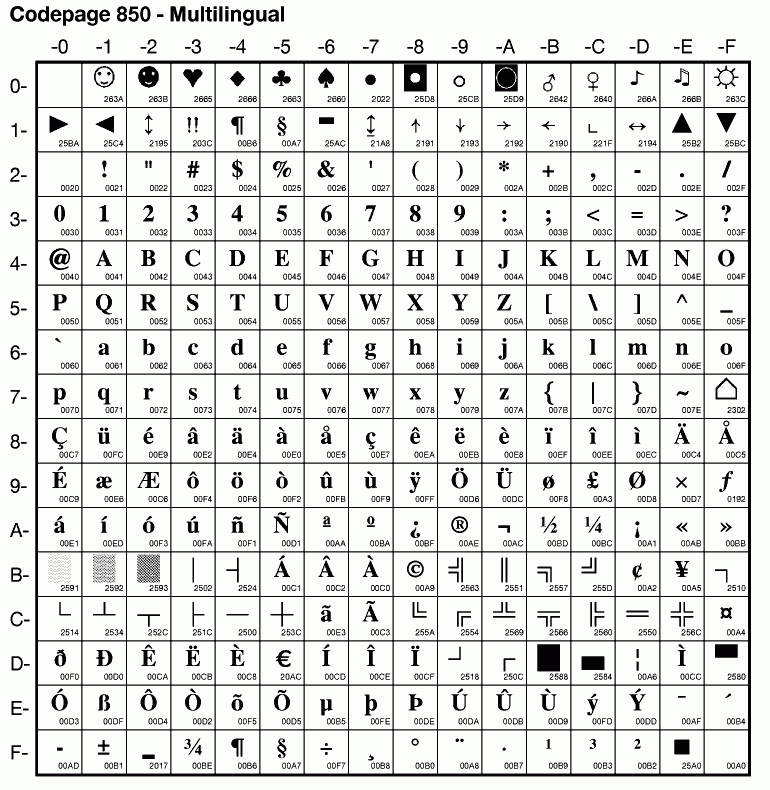 // 1: Ascii-Zeichen bis 255 verfuegbar, Codepage 850