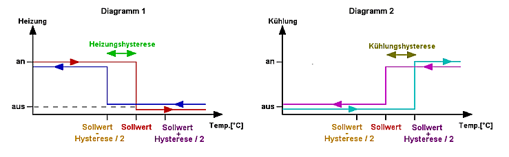 - LED 2 : COOL - LED 3 : STANDBY Belegen sie die beiden globalen Variable cool_stat und heat_stat mit dem Wert 0; Allgemeines In den Eingabefelder und in den beiden globalen Variable cool_stat / heat_stat sind alle Informationen enthalten, die der Regler benötigt, um Arbeiten zu können. An dieser Stelle möchte ich die Eingabezeile 3, die nach - Hyst. [°K] - umbenannt wurde, etwas genauer erklären. Hyst. ist die Abkürzung für Hysterese. Auch wenn euch das Wort vielleicht nicht geläufig ist, kommt ihr mit Hysterese häufiger in Kontakt. In unserem speziellen Reglerfall hier bedeutet das, dass ein Einschaltpunkt (für bspw. die Heizung) ein anderer ist, als der Ausschaltpunkt. Gleiches gilt hier auch für die Kühlung: Einschaltpunkt ist ein anderer als der Ausschaltpunkt. Ein Beispiel für Hysterese in unserem Fall: